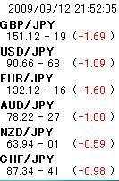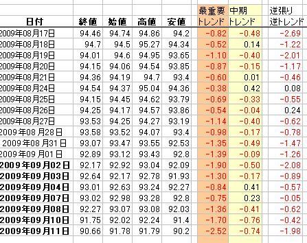 2009/09/12 - レイリーさんの株式ブログ。タイトル:「9/12」 本文:09.09.12 ドル/円 天井予想 96.75 中間値 93.78 底予想 90.81 ものすごいドル安。 なにがあったのか?? いまだトレンドはマイナス。