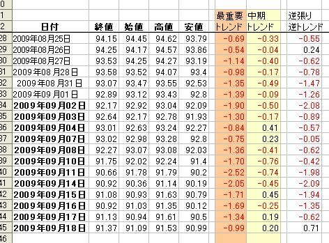 2009/09/19 - レイリーさんの株式ブログ。タイトル:「ギャンブル」 本文:20090919 天井予想 95.48 中間値 92.825 底予想 90.17 これだけ円高が続いている理由が、選挙の影響だけとは考えられない。