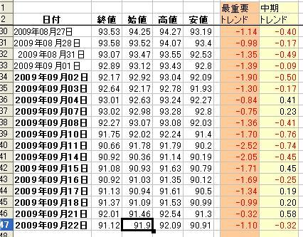 2009/09/23 - レイリーさんの株式ブログ。タイトル:「9/23」 本文:20090923 ドル/円 天井予想95.11 中間値92.59 底予想90.06 未だ底予想が90円台のものの、若干のドル高に。RSIは少し上昇。