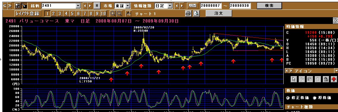 2009/09/30 - rikakusenninさんの株式ブログ。タイトル:「思い込みチャート、裏切りチャート」 本文:本日、大引けで、思い込みチャート、3点底で、強力買いサイン発生 2491 バリューコマース 月→→長い陰線で近々の底値 火→→短い陽線で底を這う 水→→長い陽線で近々の底値を離れる
