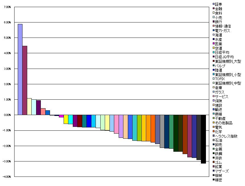 2009/10/05 - tetsuさんの株式ブログ。タイトル:「指数・業種別騰落ランキング」 本文:1.証券 5.88%(-1.45%) 2.金融 4.47%(-2.20%) 3.食料 1.09%(-2.15%) 4.小売 1.00%(-2.29%) 5.銀行 0.94%(-2.14%)