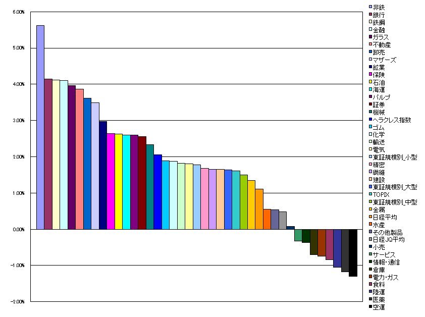 2009/10/07 - tetsuさんの株式ブログ。タイトル:「指数・業種別騰落ランキング」 本文:1.非鉄 5.62%(2.43%) 2.銀行 4.15%(2.36%) 3.鉄鋼 4.11%(1.64%) 4.金融 4.10%(-0.84%) 5.ガラス 3.96%(1.38%)