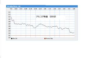 話題のアルコアは、高く始まったのですが、ザラバで上げ幅を縮小しました。