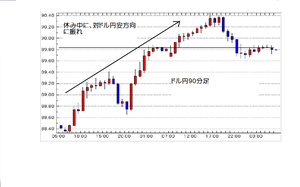 ザラバで堅調な展開を想定する理由は、休み中に対ドル円レートが大きく円安方向に振れたためです。