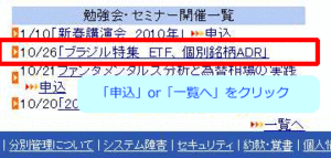 楽天証券へログイン後、画面下の「勉強会・セミナー開催一覧」から「ブラジル特集 ETF、個別銘柄ADR」のとなりにある「申込」のリンクをクリックします。