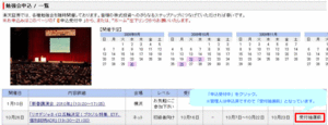 「一覧へ」をクリックすると、勉強会申込/一覧画面が表示されます。ブラジル特集のセミナーを選び、一覧表右側の「申込受付中」のリンクをクリックしてください。(B)に進みます。※管理人はすでに申込を終了していますので、「受付抽選前」となっています。