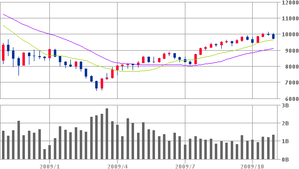 2009/10/31 - 影さんの株式ブログ。タイトル:「どうなる紐育? 」 本文:週末恒例の週足分析でござりまするが、週末久々に紐育が大きく下げており、週明けは東京市場への影響も必至のため、今週はダウのチャートを見てみたいと存じまする。まずは日経の指標から。