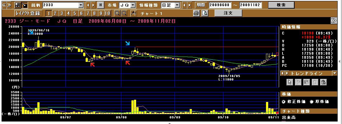 2009/11/04 - rikakusenninさんの株式ブログ。タイトル:「2333:ジーモードが元気!」 本文:ミクシィに納入するゲームが絶好調とか? うまそうなチャートですが、上には売りが待ってます さて? 売り買いは自己責任