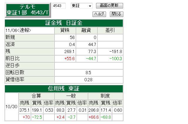 2009/11/06 - 月とスッポンさんの株式ブログ。タイトル:「テルモ決算説明会&医療機器関連銘柄☆」 本文:・テルモ 引け前に大口買い連発高値ひけ。雇用統計前だし、空売りの買い戻しかな???と思って貸借倍率みると、、、 空売りの返済、まったくすすんでない。