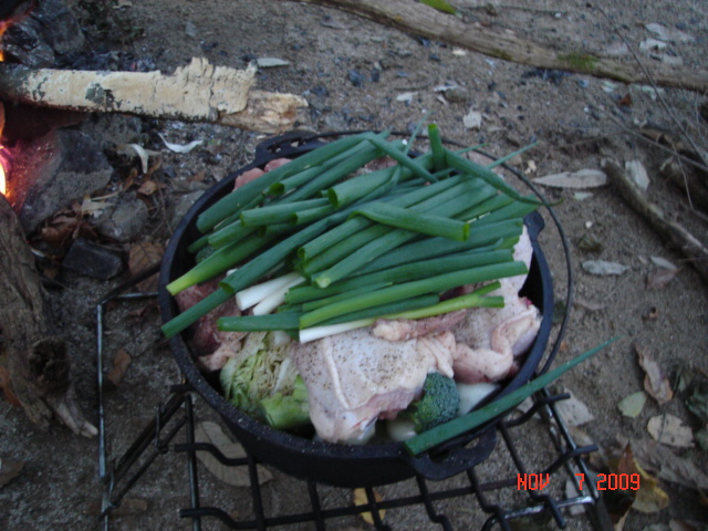 ダッジオーブンに軍鶏肉、ジャガイモ、キャベツ、ブロッコリー、ニンニク等を詰め込み塩・胡椒して焚き火で加熱するだけですが、酒類との相性は抜群です。