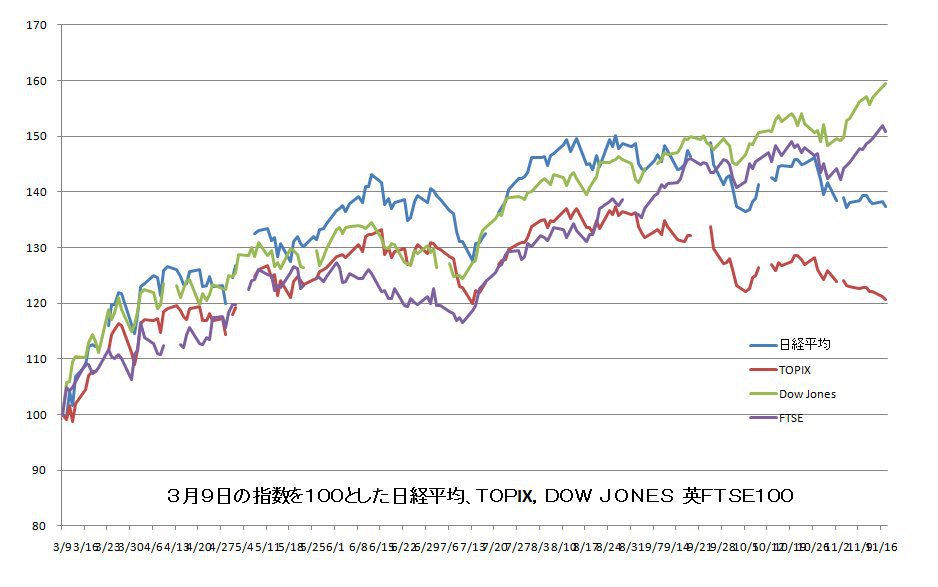 最初のグラフは日経平均、TOPIX、ダウとイギリスFTSE100を比べてみました。