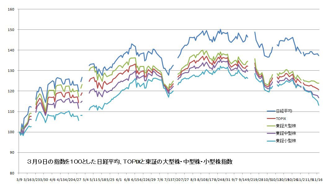そこで次のグラフは東証の大型株、中型株、小型株の