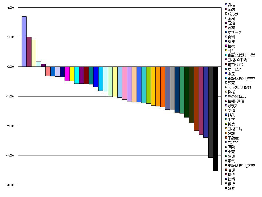 2009/11/19 - tetsuさんの株式ブログ。タイトル:「指数・業種別騰落ランキング」 本文:1.繊維 1.70%(0.15%) 2.金融 1.01%(-4.87%) 3.パルプ 0.93%(-0.04%) 4.金属 0.17%(-0.74%) 5.石油 0.10%(-2.50%)