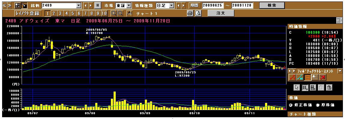 2009/11/20 - rikakusenninさんの株式ブログ。タイトル:「2489:アドウェイズ お待たせの買いサイン!!?」 本文:多分、多分ではあるが、買いサインとなるであろう値運び。 本日、高値引けなら、うししであります 自己責任といいつつも、誰かお金かしてちょんまげー Orz