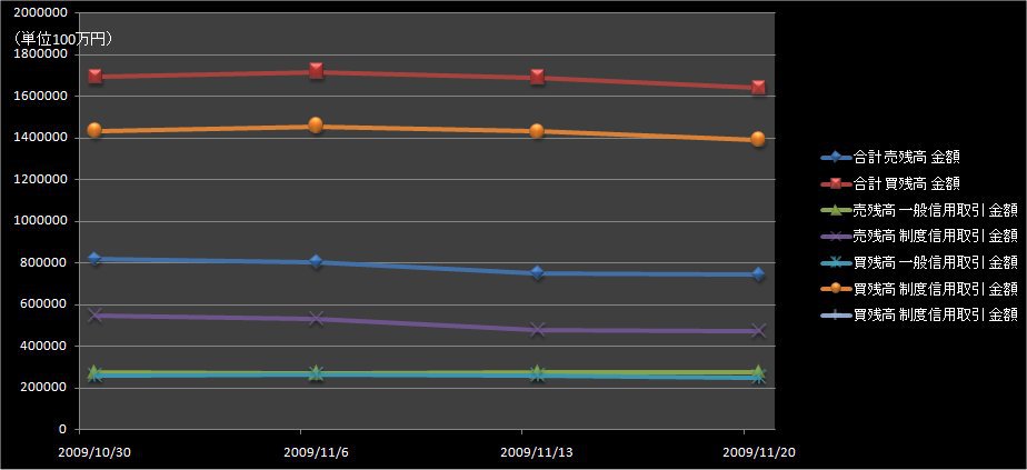 東京証券取引所が発表した11月20日申込時点の信用取引の買い残高(東京・大阪・名古屋3市場、制度信用と一般信用の合計)は先週に引き続き減少した。買い残高は前の週(11月13日申し込み時点)に比べ504億円減の1兆6398億円。