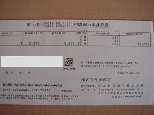 2009/12/10 - 坂本彰さんの株式ブログ。タイトル:「藤商事 6257配当金が届きました」 本文:藤商事 6257から配当金の連絡通知が 届きました。 金額は少ないですが、やはり嬉しいです。 無駄に使わず、次の種銭に回します。