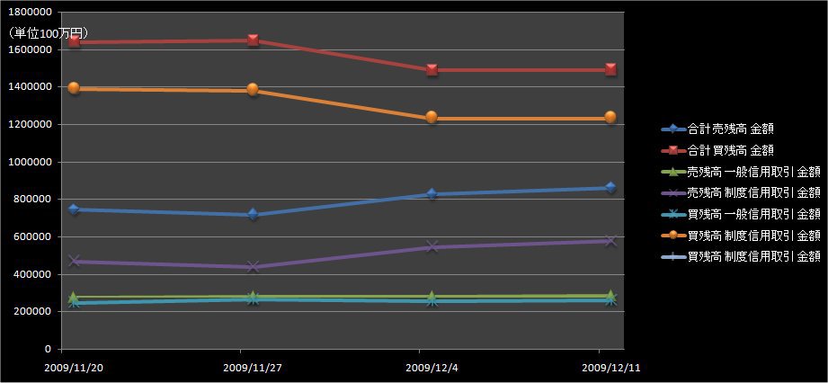 2009/12/15 - tetsuさんの株式ブログ。タイトル:「信用取引現在高(一般信用取引・制度信用取引別) 」 本文:東京証券取引所が発表した12月11日申込時点の信用取引の買い残高(東京・大阪・名古屋3市場、制度信用と一般信用の合計)は先週とほぼ変わらず若干の増加。