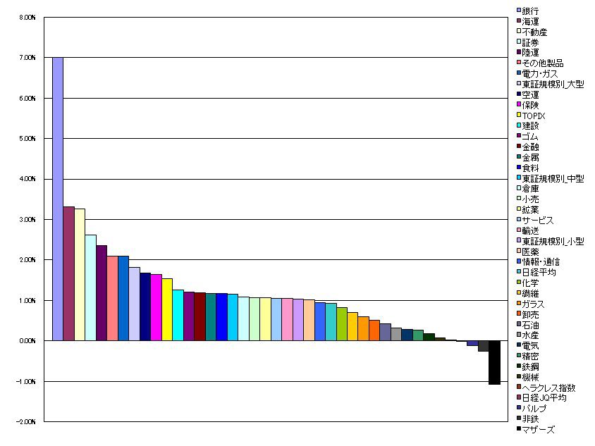 2009/12/16 - tetsuさんの株式ブログ。タイトル:「指数・業種別騰落ランキング」 本文:1.銀行 7.00%(-0.02%) 2.海運 3.31%(-1.48%) 3.不動産 3.27%(2.95%) 4.証券 2.62%(0.52%) 5.陸運 2.36%(-0.72%)