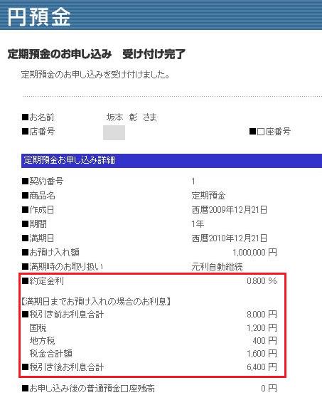 2009/12/22 - 坂本彰さんの株式ブログ。タイトル:「ソニー銀行の定期預金」 本文:ソニー銀行の定期預金を使いました。 円1年定期で金利が0.8%です。 税を引くと0.64%、6400円の利息しか 残りませんが、普通預金よりはいいです。