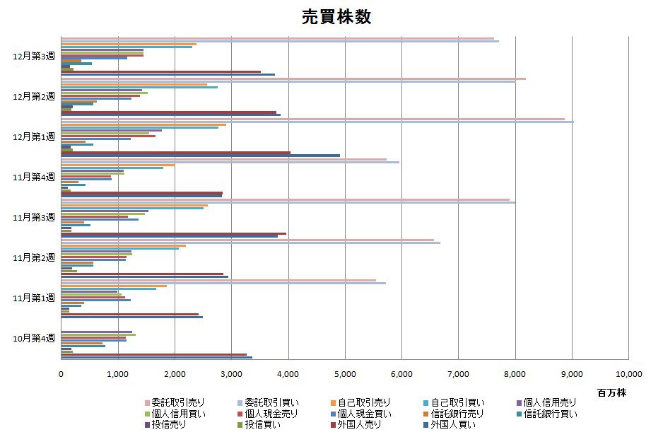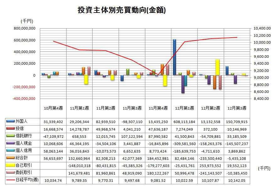 2009/12/25 - tetsuさんの株式ブログ。タイトル:「12月第3週投資主体別売買動向(グラフ)」 本文:日経平均は、34円18銭、0.34%と小幅なプラス。 外国人投資家の本格的な売買は年内最後の週? 4週連続の買い越しとなり買い越し額は1507億円と先週から大きく増加しました。