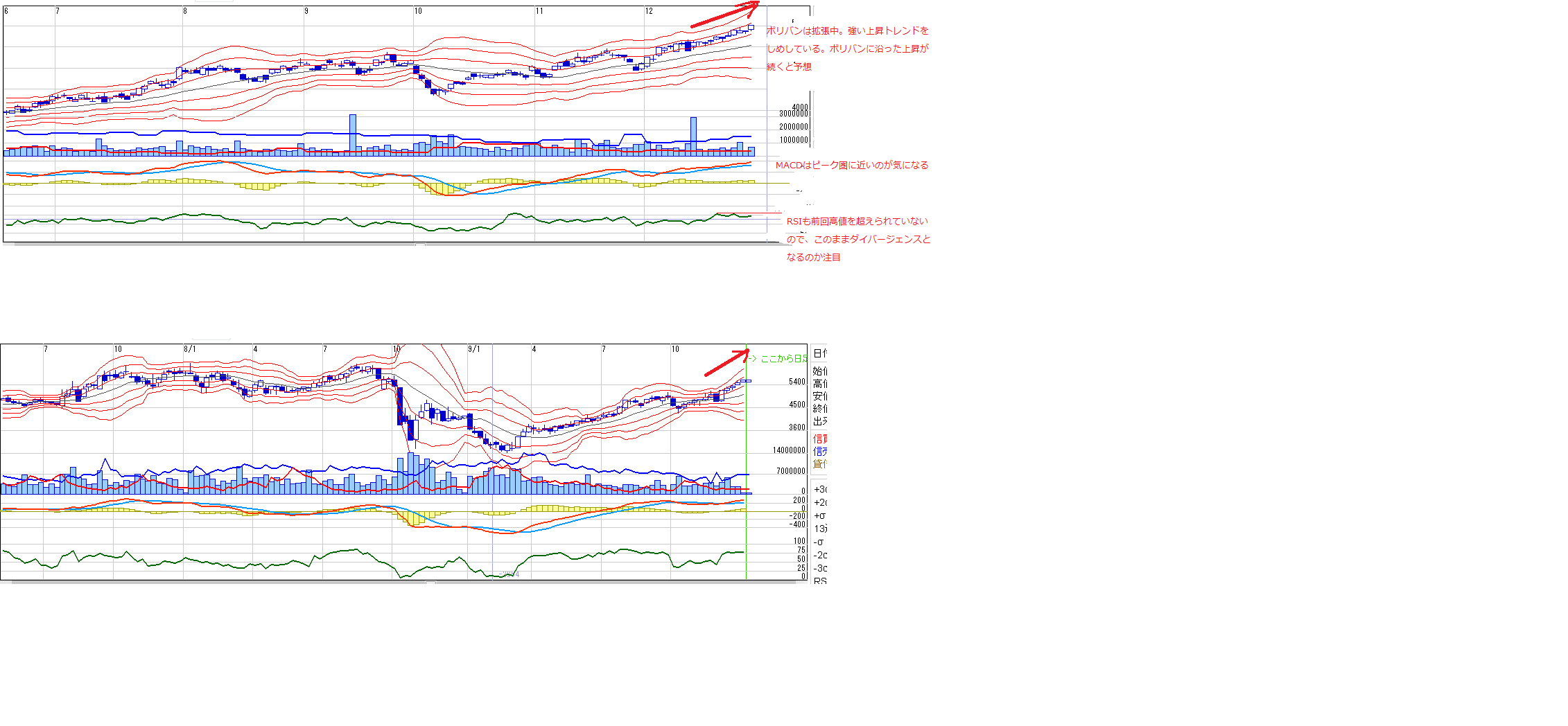 テルモはレンジ上限に到達したのでたしかに上値は重くなりそうなんですけど、ボリバン見ると強い上昇トレンドを示してるんですよね、、、で、ボリバンが収縮はじめるまではとことんのっかってこうかと思ってます^^
