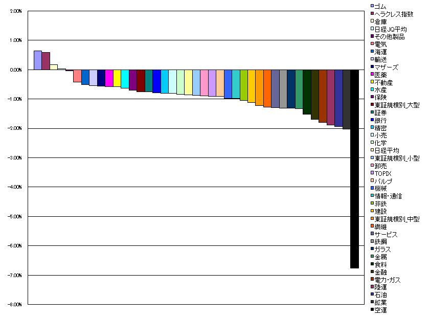 2009/12/30 - tetsuさんの株式ブログ。タイトル:「指数・業種別騰落ランキング」 本文:1.ゴム 0.65%(0.38%) 2.ヘラクレス指数 0.59%(0.59%) 3.倉庫 0.17%(0.24%) 4.日経JQ平均 0.03%(0.08%) 5.その他製品