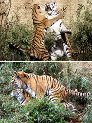 トラ、多摩動物園、格闘技:格闘技かとも思えるトラのしぐさ。多摩動物園より。(Y)