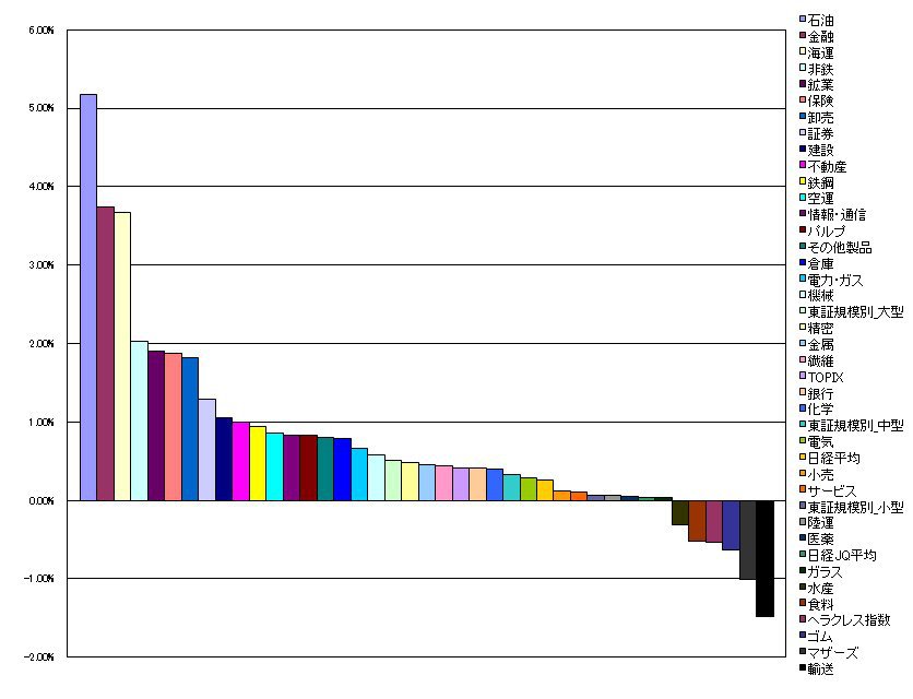 2010/01/05 - tetsuさんの株式ブログ。タイトル:「指数・業種別騰落ランキング」 本文:1.石油 5.17%(0.67%) 2.金融 3.74%(0.19%) 3.海運 3.67%(0.65%) 4.非鉄 2.03%(1.70%) 5.鉱業 1.90%(1.77%) 6.保険