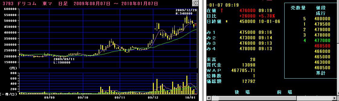 2010/01/07 - rikakusenninさんの株式ブログ。タイトル:「3793:ドリコム ドリームを見ようってか??」 本文:3793:ドリコム が買いサインとなるか? ドリームを見ようってか?? N波形成!!! 自己責任でお願いします。
