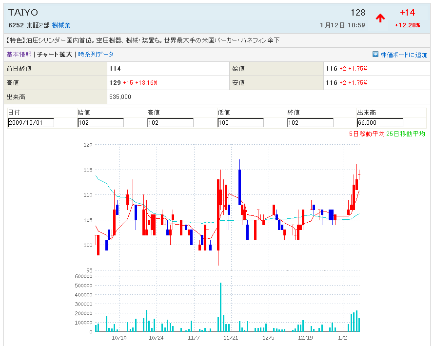 2010/01/12 - rikakusenninさんの株式ブログ。タイトル:「6252:TAIYO が買いサインとな???」 本文:6252:TAIYO が買いサインとなります 太陽電池、燃料電池用生産機器を開発中とか 期待します さて??? あなたの投資判断は自己責任ですよね