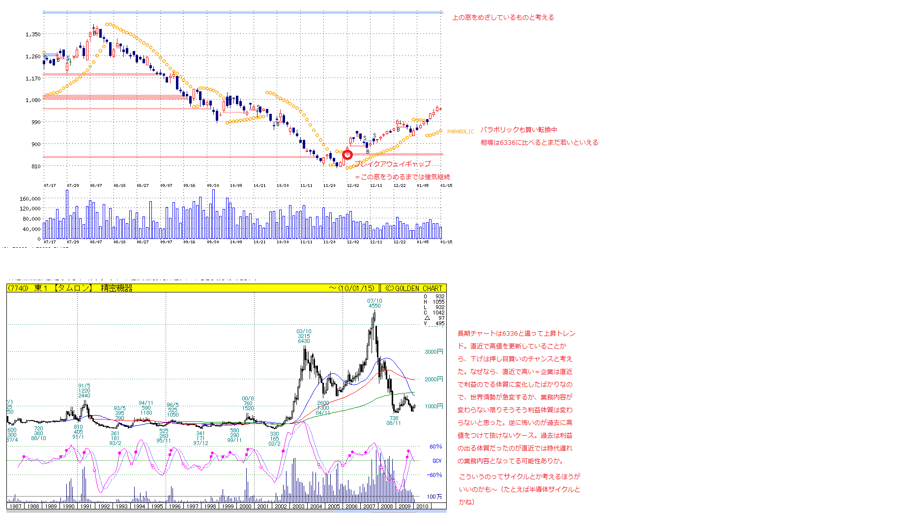 2010/01/16 - 月とスッポンさんの株式ブログ。タイトル:「7740 タムロン☆チャート分析」 本文:☆日足強気、週足弱気、長期強気 ・あたしが銘柄選びの参考にしているのは、2006年~2007年で高値をつけてる銘柄。