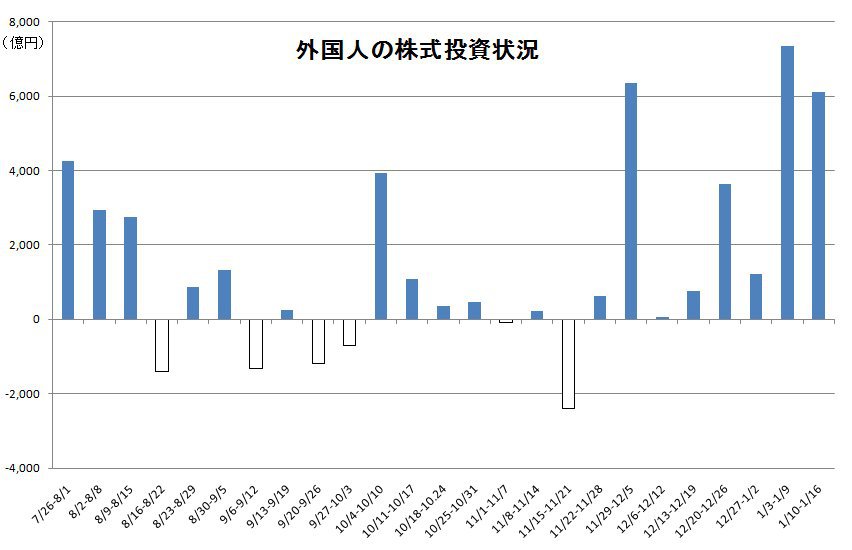 2010/01/21 - tetsuさんの株式ブログ。タイトル:「対外及び対内証券売買契約等の状況」 本文:対内証券投資【非居住者による取得・処分】←外国人 平成22年1月10日~1月16日 株式 取 得 処 分 ネット 33,560 27,442 6,119