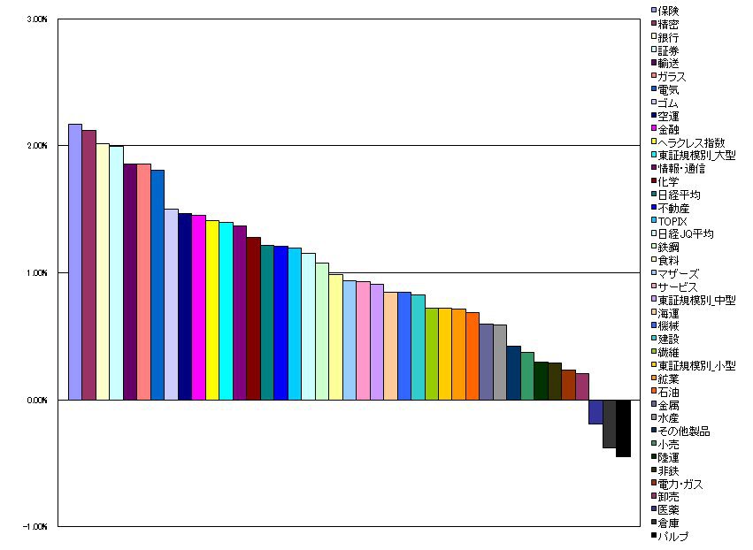2010/01/21 - tetsuさんの株式ブログ。タイトル:「指数・業種別騰落ランキング」 本文:1.保険 2.17%(0.27%) 2.精密 2.12%(-0.14%) 3.銀行 2.01%(-0.91%) 4.証券 2.00%(-2.92%) 5.輸送 1.86%(-0.94%)