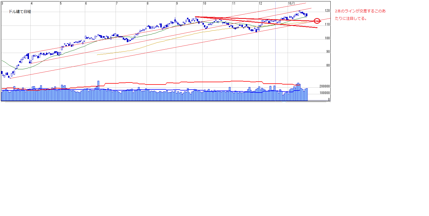 2010/01/24 - 月とスッポンさんの株式ブログ。タイトル:「来週のチャートポイント②」 本文:遅くなりましたが、、、続きです ☆エリオット(画像1) ・2つのシナリオを考えてみました。 ☆一目雲の追加(画像2) ☆ドル建て日経(画像3)