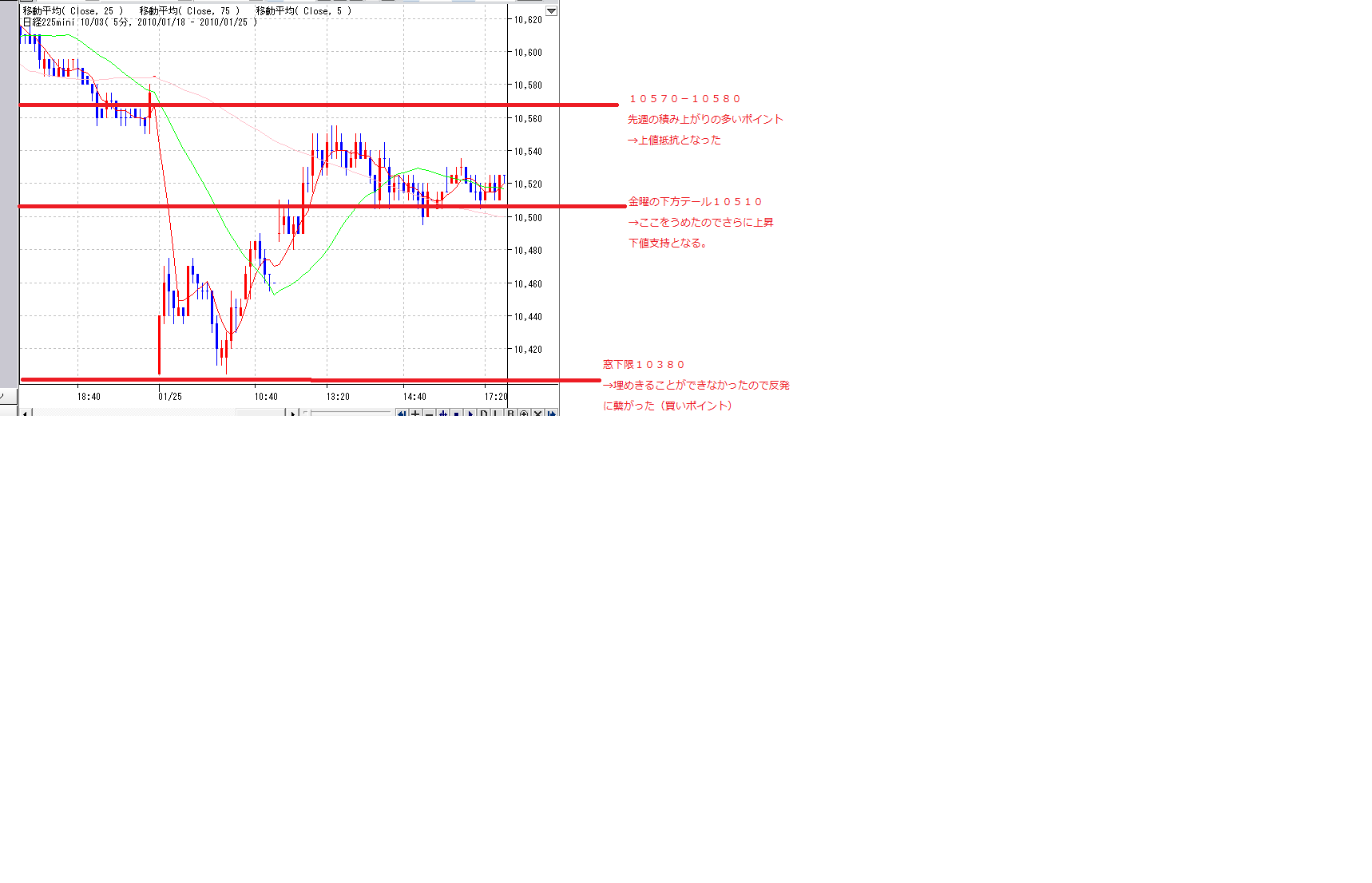2010/01/25 - 月とスッポンさんの株式ブログ。タイトル:「1・25本日のチャート②デイトレポイント」 本文:☆分足とMPの様子(画像1) ①はこちら http://minkabu.jp/blog/show/206824