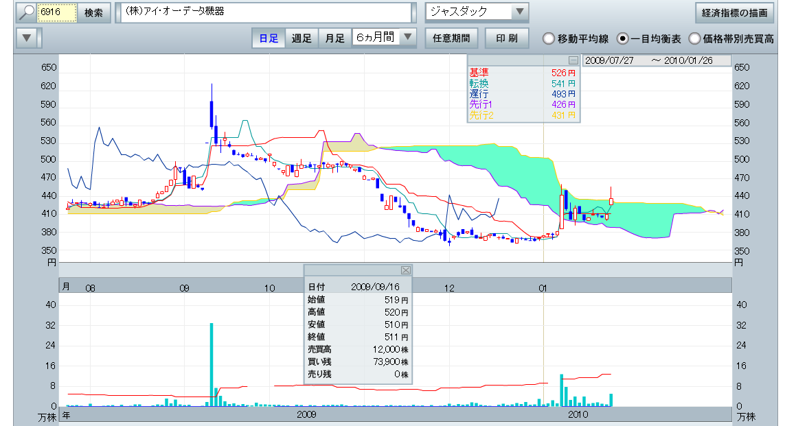 2010/01/26 - rikakusenninさんの株式ブログ。タイトル:「6916:アイ・オーが買いサインとな???」 本文:6916:アイ・オーが1月7日に買いサインとなって、今日は陽線で終われば、雲ヌケです この時間、押してますから買い場でしょう