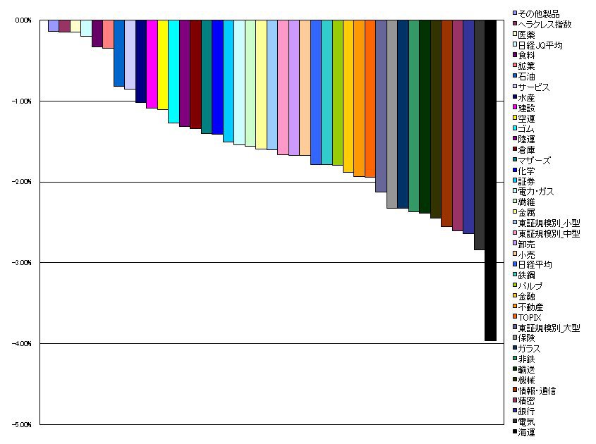 2010/01/26 - tetsuさんの株式ブログ。タイトル:「指数・業種別騰落ランキング」 本文:1.その他製品 -0.15%(0.02%) 2.ヘラクレス指数 -0.15%(-0.29%) 3.医薬 -0.15%(-0.56%) 4.日経JQ平均 -0.20%(0.75%) 5.食料