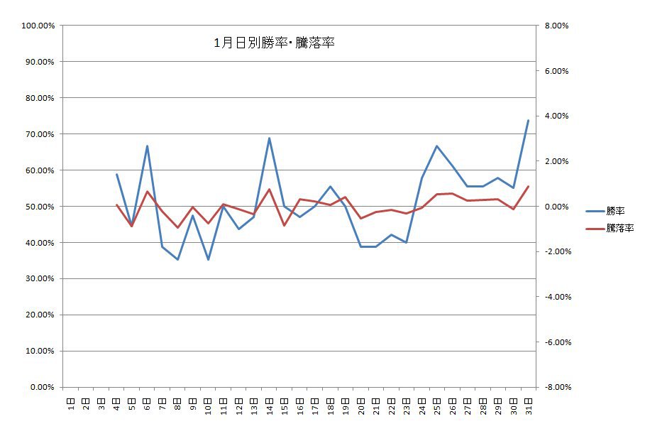 2010/01/26 - tetsuさんの株式ブログ。タイトル:「明日の確立」 本文:過去にさかのぼって 1月27日 の騰落率を調べました。 データは1984年1月から。引用元Yahoo!米国版 25年間のうち、 市場が開いていた:18日 上昇した日:10日