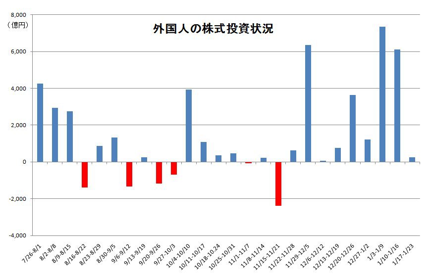 2010/01/28 - tetsuさんの株式ブログ。タイトル:「対外及び対内証券売買契約等の状況」 本文:対内証券投資【非居住者による取得・処分】←外国人 平成22年1月17日~1月23日 株式 取 得 処 分 ネット 3,516 3,256 260