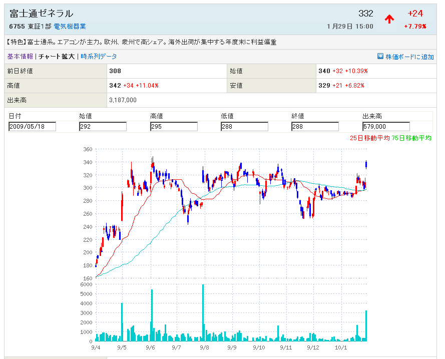 2010/01/29 - rikakusenninさんの株式ブログ。タイトル:「6755:富士通ゼネラルが週足で雲ヌケとな???」 本文:6755:富士通ゼネラルが週足で雲ヌケとなりました 画期的なことです この会社、中近東に強い販売力をもってます 一夫多妻制の国が多いのです
