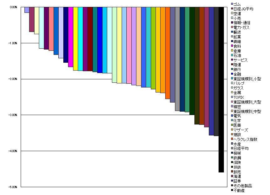 2010/02/05 - tetsuさんの株式ブログ。タイトル:「指数・業種別騰落ランキング」 本文:1.ゴム -0.16%(-0.29%) 2.日経JQ平均 -0.69%(-0.22%) 3.空運 -0.75%(-1.09%) 4.小売 -1.15%(0.95%) 5.情報・通信