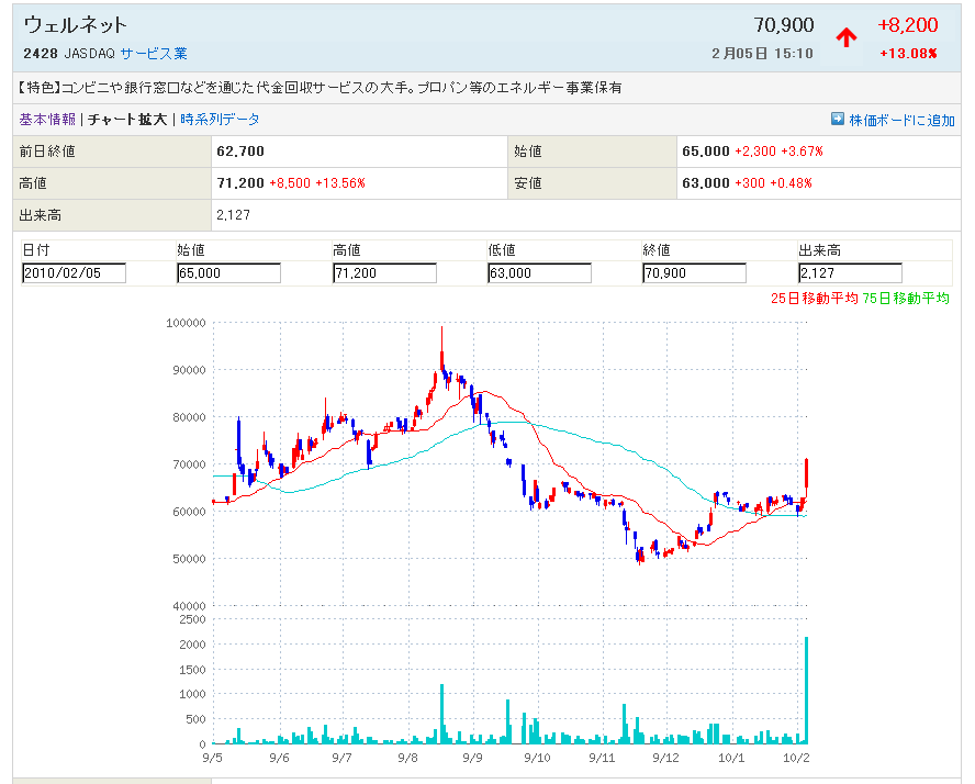 2010/02/06 - rikakusenninさんの株式ブログ。タイトル:「2428:ウェルネットが急騰しましたが???」 本文:2428:ウェルネットが急騰しましたが月曜は寄り天でしょうか? それとも、さらに上げるのでしょうか? 自己責任でお願いします。 第1関門は、68000で、これを超えました