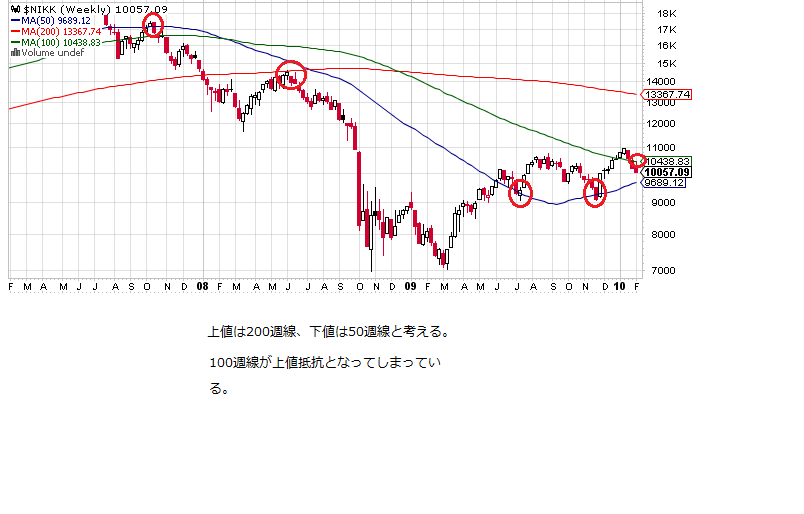 2010/02/07 - 月とスッポンさんの株式ブログ。タイトル:「来週のチャートポイント①」 本文:☆トレンドラインとファンライン(画像1) ☆週足のポイント(画像2) ☆ボリバン(画像3)