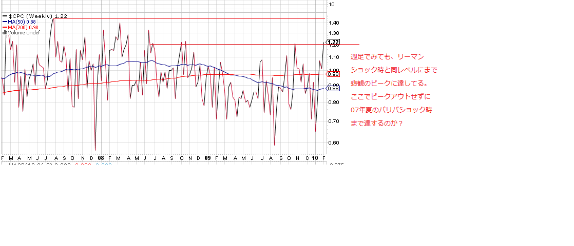 2010/02/07 - 月とスッポンさんの株式ブログ。タイトル:「来週のチャートポイント⑤NY編ー2」 本文:☆プットコールレシオ日足(画像1) ☆プットコールレシオ週足(画像2) ・プットコールレシオは投資家の心理を読むのに役立つと思ってます。 プットコールレシオは株価と逆相関で考えます。