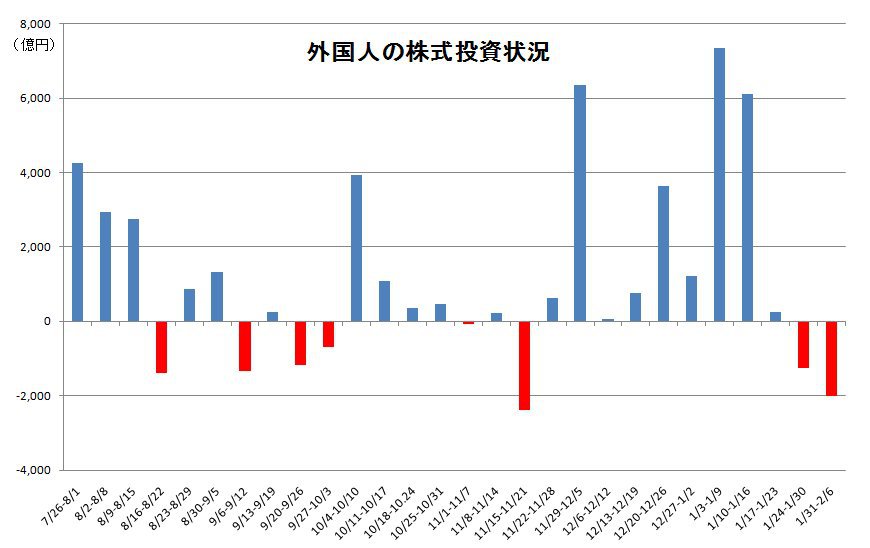 2010/02/12 - tetsuさんの株式ブログ。タイトル:「対外及び対内証券売買契約等の状況 」 本文:対内証券投資【非居住者による取得・処分】←外国人 平成22年1月31日~2月6日 株式 取 得 処 分 ネット 2,929 4,950 △2,021