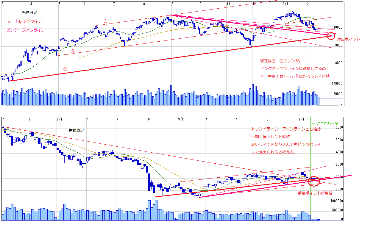 2010/02/13 - 月とスッポンさんの株式ブログ。タイトル:「来週のチャートポイント①」 本文:☆トレンドラインとファンライン(画像1)