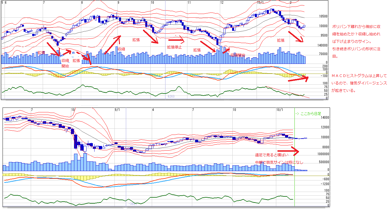 ・日足ボリバンは下離れの拡張から、わずかですが、拡張角度が緩やかになり、拡張がとまりそうな感じです。