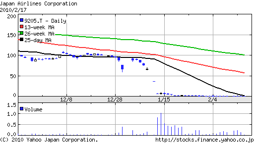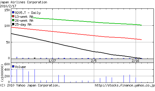 2010/02/18 - ぷよすけさんの株式ブログ。タイトル:「JAL(9205)日足」 本文:哀れなチャートですね。底にべったり。