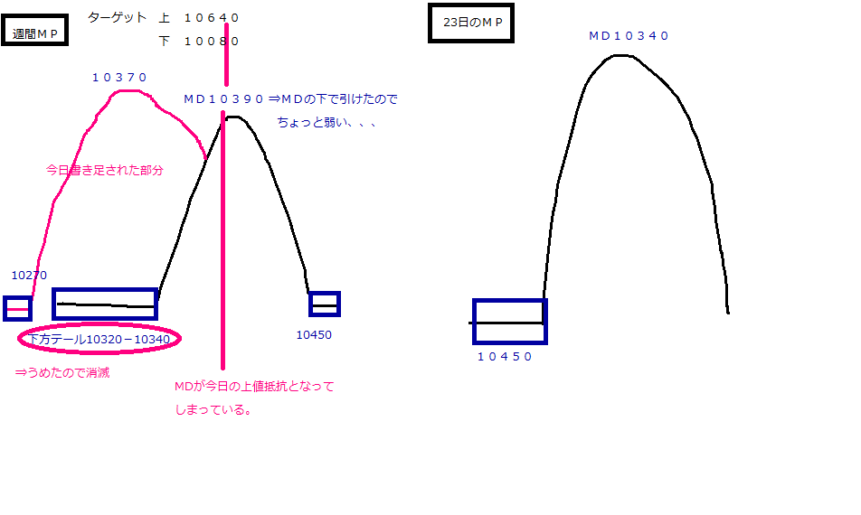 2010/02/23 - 月とスッポンさんの株式ブログ。タイトル:「本日のチャート①」 本文:☆先週のMP(画像1) ピンクが今日のポイント ☆週燗MPと今日のMP(画像2) ・昨日MDをわってひけたので今日は弱い展開を予想。 MDの下で寄り付き、MDが上値抵抗となった。