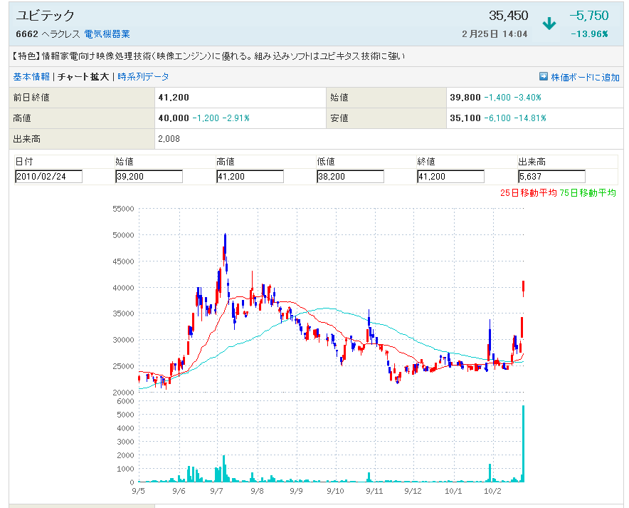 2010/02/25 - rikakusenninさんの株式ブログ。タイトル:「6662:ユビテックは買いか売りか???」 本文:6662:ユビテックは買いか売りか??? 急騰したが本日は5000ほど押しています 陽線がもう1週つくと、週足でGC発生です 第1関門は、32900で超えました